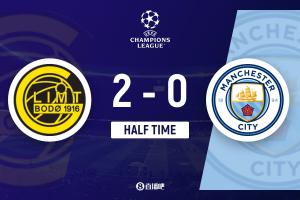 半场-曼城0-2博德闪耀 阿莱恩被断送礼 霍格2分钟双响布隆伯格2助