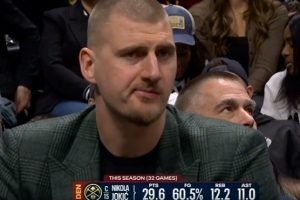 挺淡定!约基奇场边便装观战 嘴里嚼着东西
