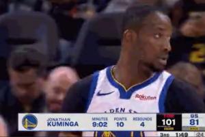 将分差缩小到20分!库明加连续打进2+1 库里替补席鼓掌庆祝