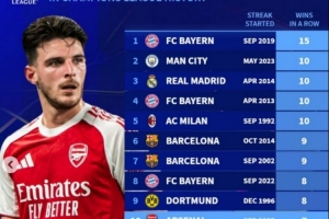 欧冠历史连胜纪录榜:拜仁15连胜高居榜首,阿森纳7连胜跻身前十