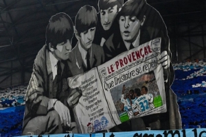 迎战利物浦,马赛主场球迷展示出披头士主题巨幅TIFO