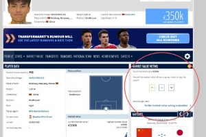 今日转会市场网上线了一个针对普通用户(访客)开放的身价评价系统(图中红圈标记处),普通用户可以对任何一个球员给出自己的评价和建议——觉得“高了”还是“低了”,这不会取代现有的身价评估体系,但将为数据管理员评估身价时提供重要的民意参考。 ​​​​