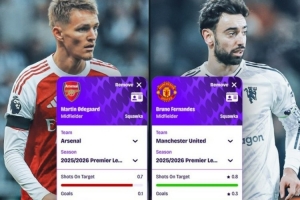 体育资讯1月23日讯 本轮英超将迎来焦点战曼联对阵阿森纳,数据网站Squawka也盘点了两队中场厄德高、B费本赛季英超场均数据对比,具体如下: