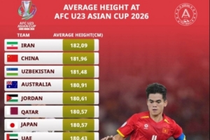 体育资讯1月24日讯 外媒统计U23亚洲杯参赛球队平均身高,中国队181.96厘米排名第二,比日本队高出约1.4厘米。