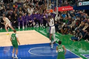 精准制导!詹姆斯长传穿越防线 艾顿篮下接球吃饼暴扣