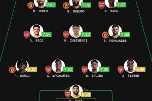 体育资讯1月25日讯 英超第23轮将迎来一场焦点战,到时阿森纳将坐镇酋长球场迎战曼联。本场比赛之前,《每日邮报》盘点了两队合体评分最佳阵(评分来自Sofascore),B费领衔曼联4将入选,萨利巴、加布里埃尔搭档中卫。