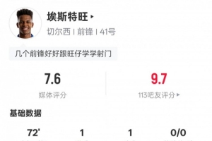 埃斯特旺本场数据:传射建功+1关键传球1过人成功,评分7.6