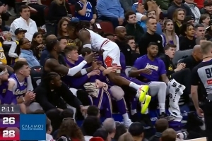 太拼了!道苏姆舍身救球 直接飞到湖人替补席里