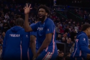 恩比德兴奋地跳起舞!麦凯恩底角三分再进 末节5分钟连中4记三分