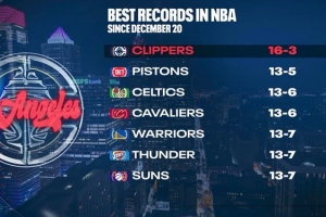 12月20日以来快船16胜3负联盟最佳 第二的活塞“仅”13胜5负