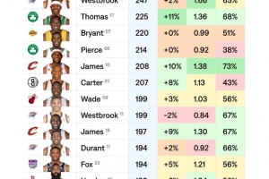 08詹姆斯关键时刻251分历史最多 17威少关键时刻每分钟1.66分