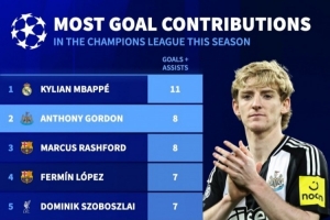 本赛季欧冠参与进球数:姆巴佩11球居首,戈登、拉什福德8球次之