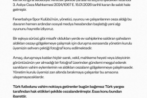 费内巴切体育俱乐部在案件结束后,通过社交媒体账户发起了一场新的舆论攻势,对此我们感到非常惊讶。这些人在作为客队时袭击了主队人员,现在却试图通过管理层成员在庭审期间拍摄的照片来掩盖他们的罪行。这张照片中没有任何被告、代理律师、法庭成员或旁听者的身影,其目的是转移公众对犯罪行为及其判决的关注。那些试图将我们的管理层成员置于嫌疑之下的人不会得逞。今天,土耳其独立司法系统已经对那些将土耳其足球推向危险境地的人进行了应有的惩罚。这才是问题的核心所在。